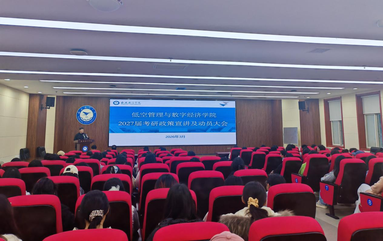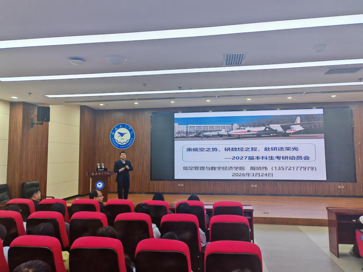 为进一步激发学生考研热情,明确备考方向,助力学子实现升学梦想,3月24日晚,低空管理与数字经济学院在莲湖校区报告厅召开2027届学生考研动员会。学院院长史亚洲,党委副书记(主持工作)仇建华、党委副书记齐刚、辅导员黄理漓参加会议,特邀学院电商教研室主任殷培伟博士担任主讲,学院有考研意愿的学生齐聚一堂,共话研途规划。