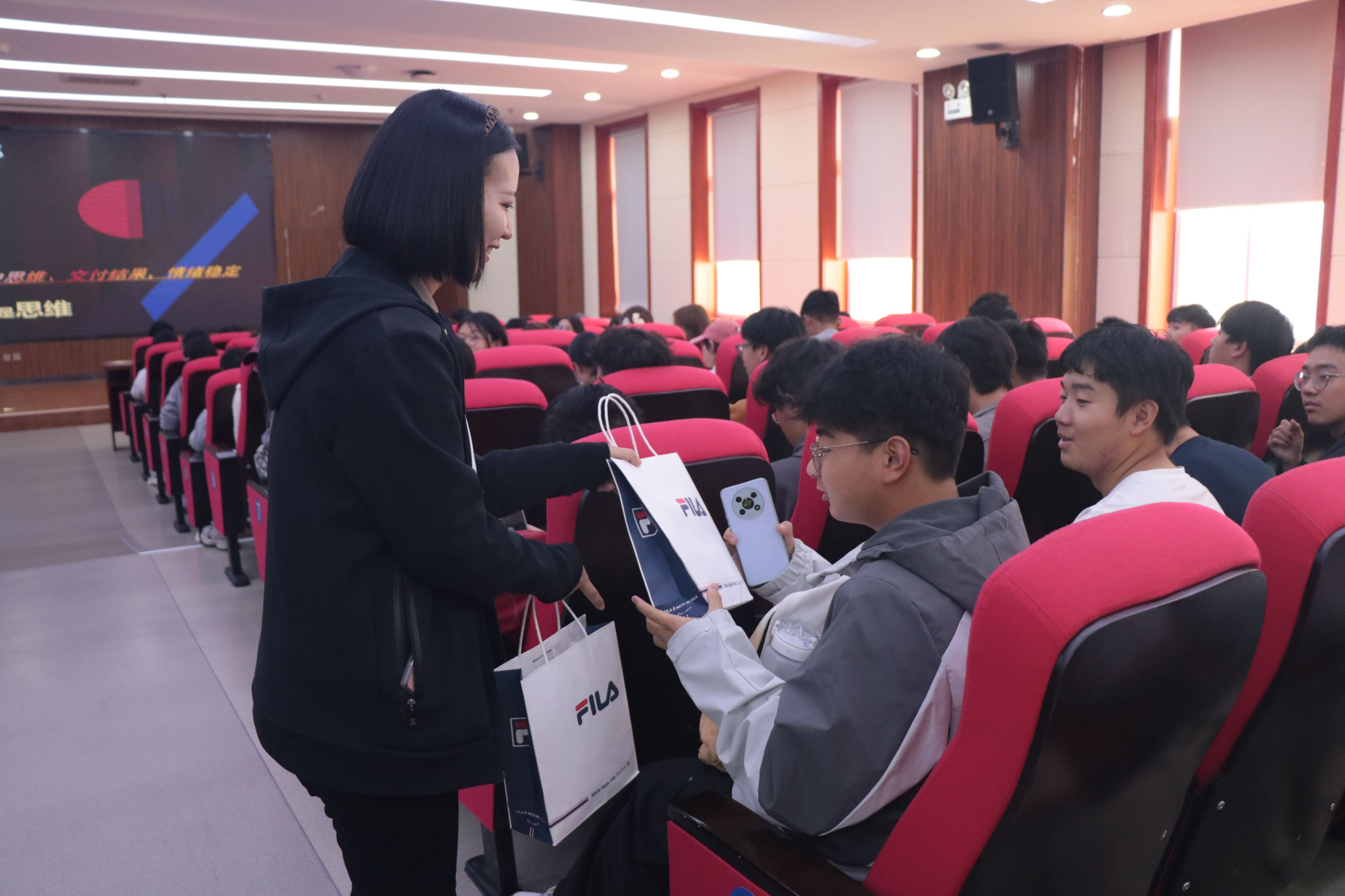 随后,程瑶校友结合自身的职业经历,从个人成长、如何做职业生涯规划、大学生成长路径三方面展开分享。她讲述了自己毕业后从华润万家西北区物流部基层业务岗位做起,转岗到人力资源岗位,再到华润万家西北区小业态管理部独当一面,最终成长为斐乐服饰人力资源副总监的职场历程。通过典型案例的分析,引导大家明确企业需要具备专业能力、创新思维与团队协作精神的人才。同时,她寄语学弟学妹们要做爱思考的行动派,在大学阶段积极探索、勇于实践。
