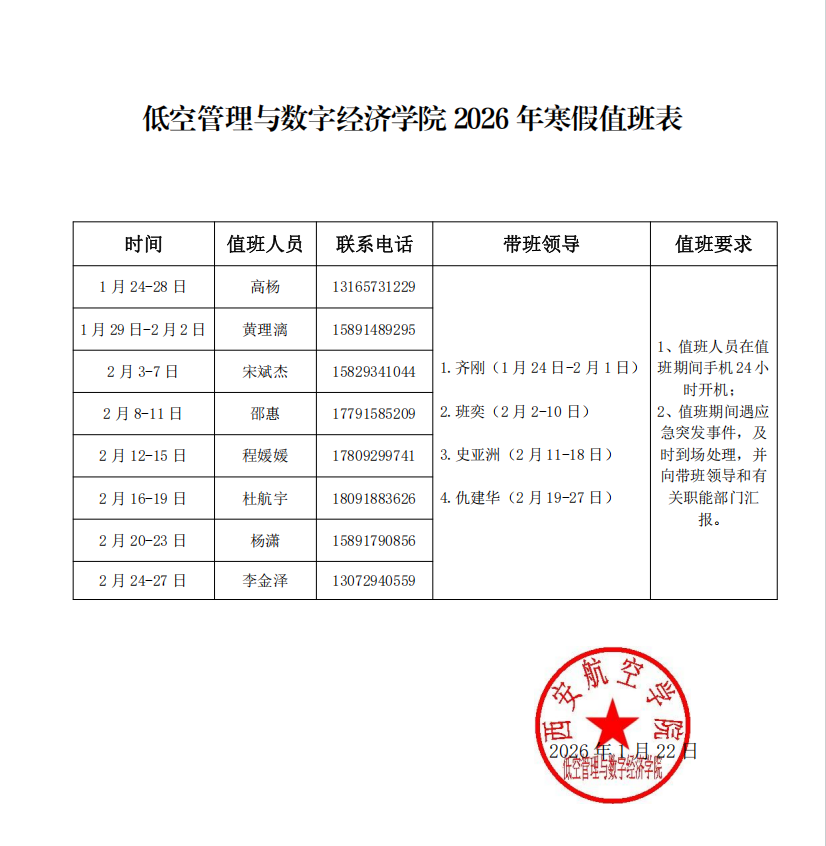 低空管理与数字经济学院2026年寒假值班表